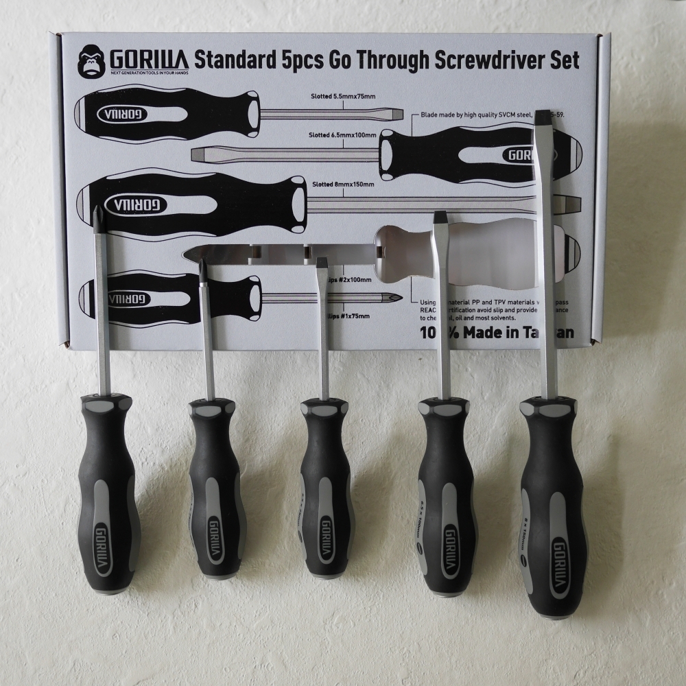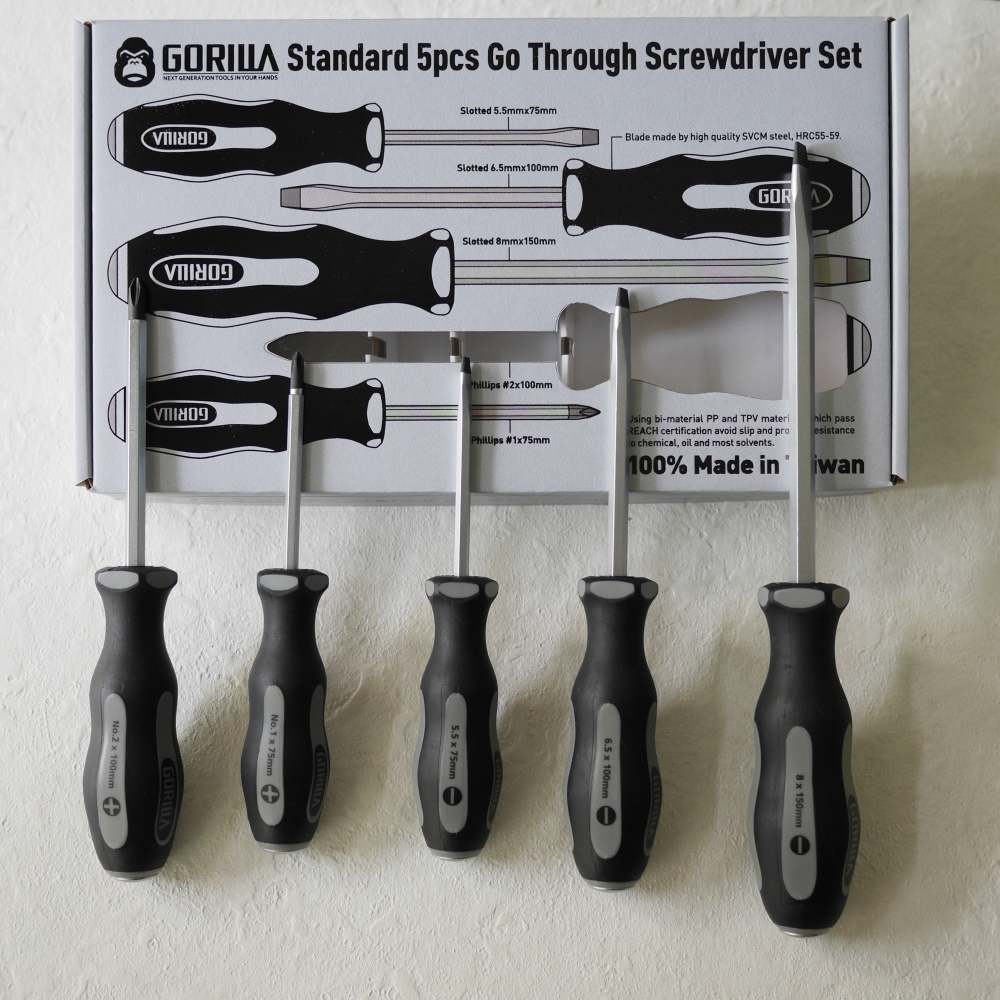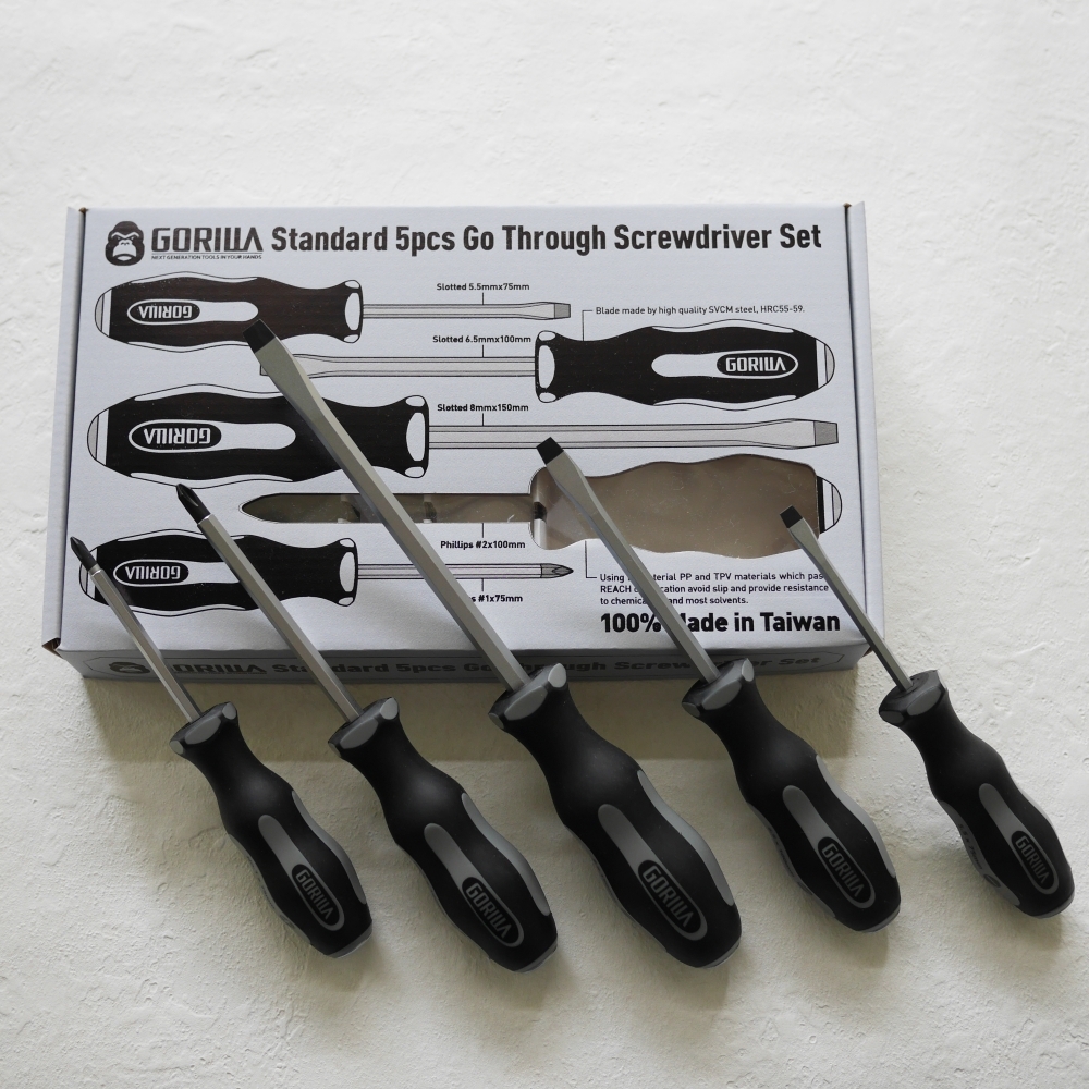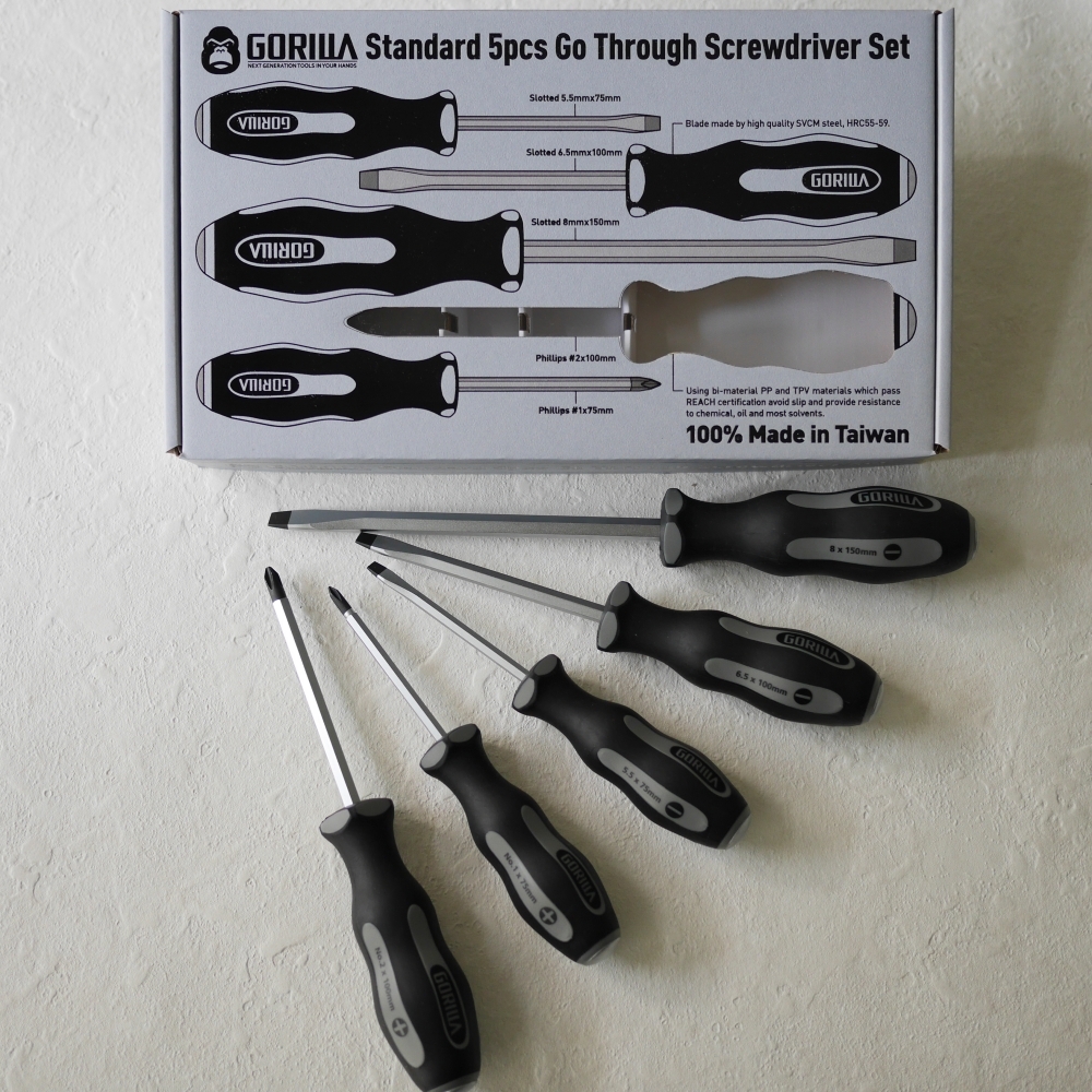 Gorilla的貫通螺絲起子為擁有67年以上經驗製作螺絲起子的台灣頂尖工廠,以專門外銷歐美的熱處理技術、精密沖切技術以及研磨技術製成,百分之百台灣製造,無論是品質還是耐用度,均為歐美精品手工具等級,這次Gorilla更以超越歐美手工具的品質進行打造而成,就是要給您最好的手工具。