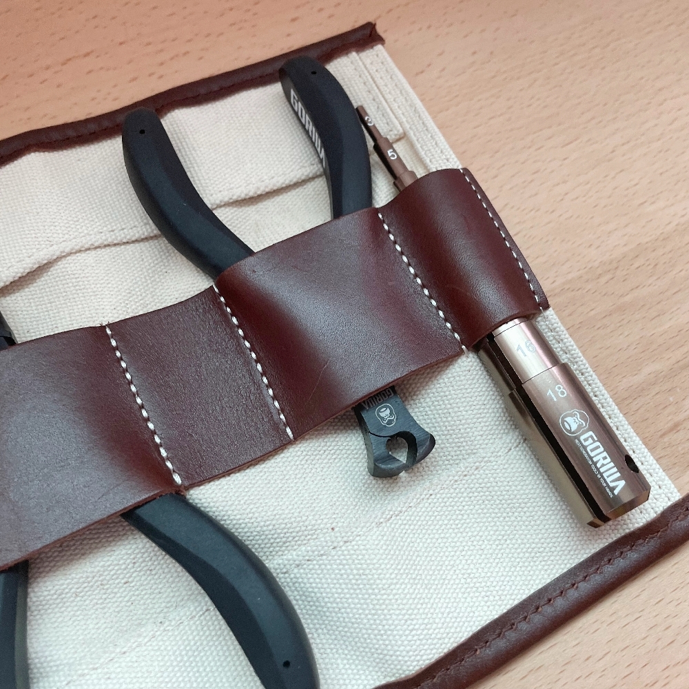 台灣知名皮件品牌Adole專為Gorilla的經典工藝鉗組量身打造而成的經典的皮革帆布卷軸工具收納袋,採用頂級頭層植鞣的牛皮製作而成。