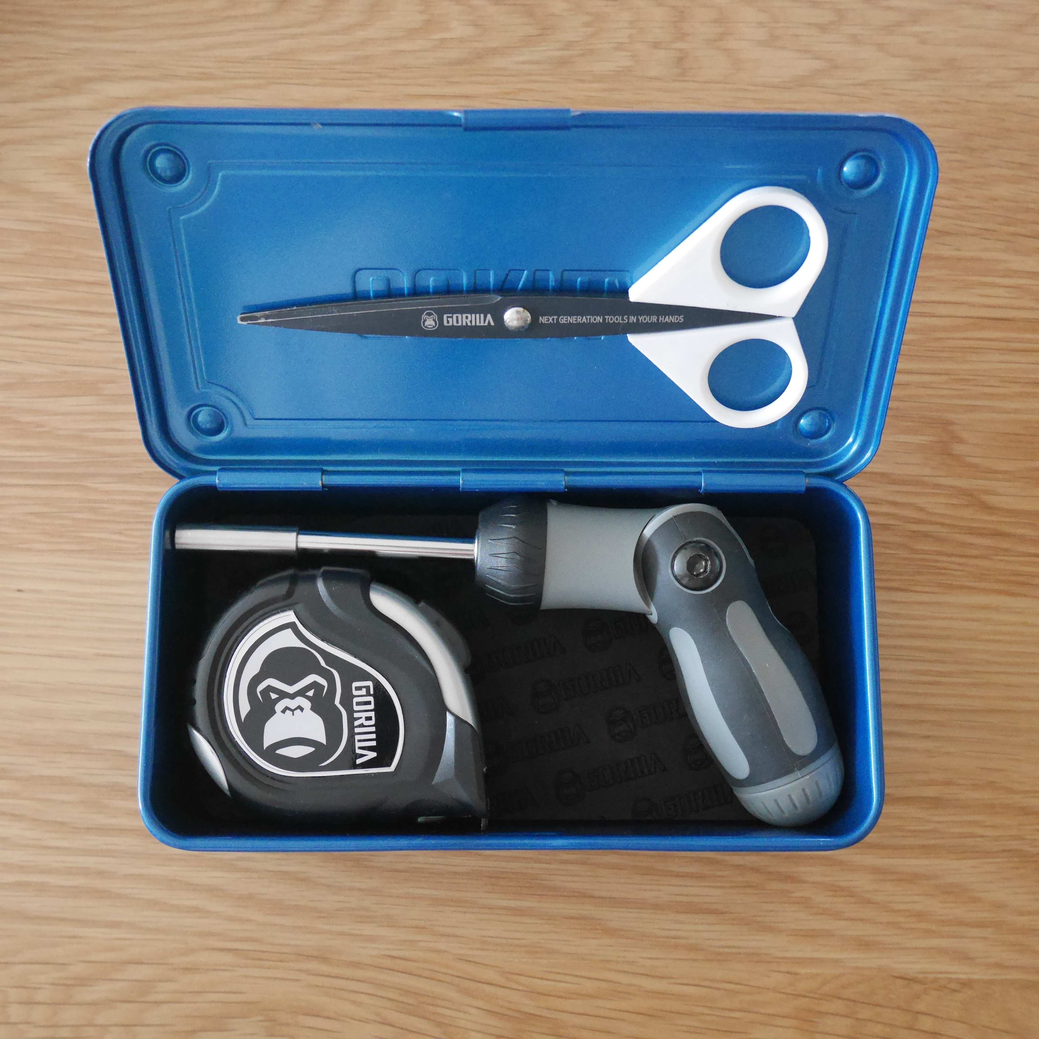Gorilla特別推出的優惠組合,含有5M捲尺*1、不沾膠文具剪刀*1、省力長棘輪起子*1、高張力鋼製工具箱*1、高張力鋼製工具箱專用EVA泡綿墊*1
